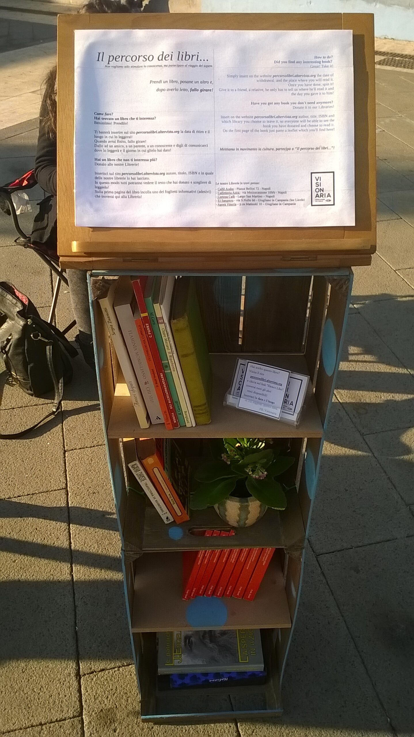 Quando a fine 2015 abbiamo deciso di “importare” questa idea nella città di Napoli e nella provincia, sapevamo dei rischi di furto e distruzione a cui eravamo esposti (cosa che è accaduta ad un nostro punto libreria, paradossalmente proprio in zona universitaria), e il primo grande passo è stato convincere i gestori dei locali increduli della gratuità dell’iniziativa e quindi vincere il loro scetticismo. Abbiamo allestito delle piccole librerie con cassettini da frutta e custodie di musicassette, utilizzate come mini-bacheche, in alcuni locali di Napoli e provincia.